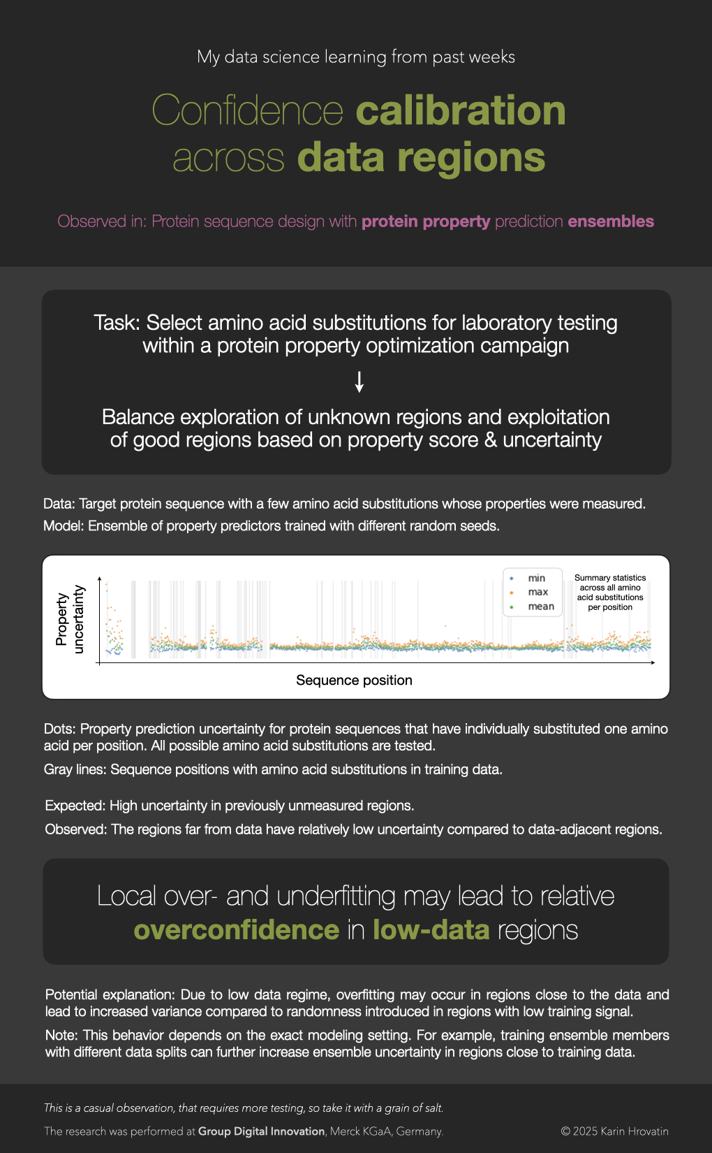 The relatively uncertainty of regions away from training data can be underestimated. One of the reasons behind this may be a combination of underfitting in regions away from data, which may result in more uniform predictions across models within an ensemble, and overfitting in regions close to the data, leading to higher variability across ensemble members.