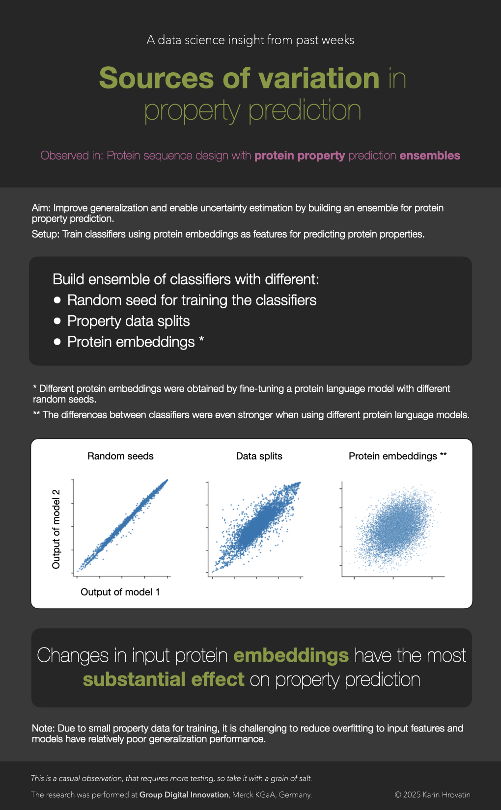 The strongest source of variation in protein property prediction (in a low-data regime) seem to be protein representations, rather than classical ensemble-building techniques (e.g., different random seeds or data splits for training).