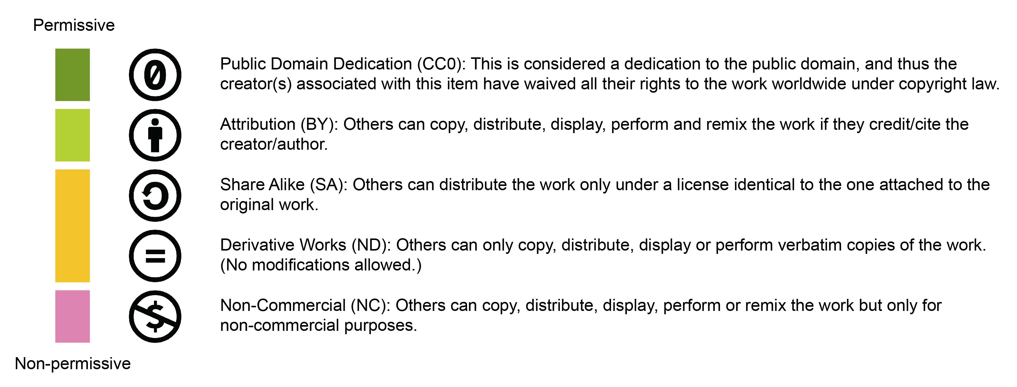 Figure 4: Overview of different license restrictions. In the Creative Commons licensing framework, different licensing restrictions can be combined to provide the desired level of content protection. Note that Creative Commons lists NC as more permissive than ND, and I have adapted the order based on my personal experience.