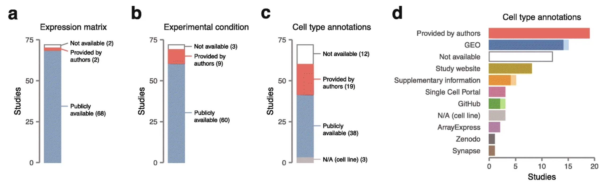 Figure 1: Unstandardized data deposition practices in the single-cell field. The image shows data availability for 72 published scRNA-seq datasets, as provided by Skinnider (2021). Availability of (a) processed gene expression matrices, (b) sample-level metadata (e.g., treatment vs. control), and (c) cell-level metadata (i.e., cell type annotation). (d) Sources from which cell type annotations were obtained, with light shades representing datasets for which multiple manual processing steps were required to obtain cell types. The image was adapted from Figure 1 of (Skinnider, 2021), which is published under CC BY 4.0 license.